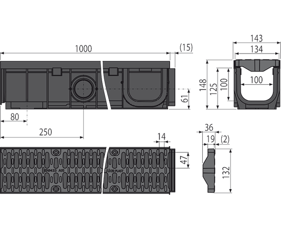 Дренажный канал 100 мм с пластиковой решеткой, класс A15, арт. AVZ104-R401