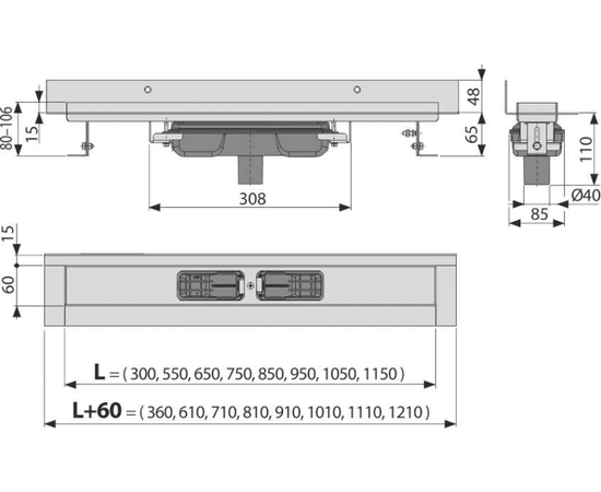 APZ1116-550 Водоотводящий желоб с порогами для цельной решетки и фиксированным воротником к стене, в