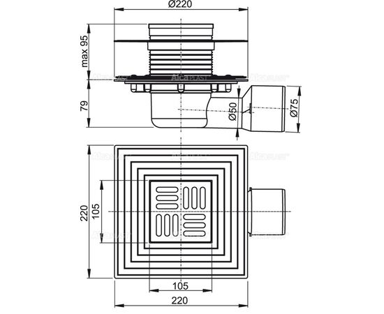 Сливной трап 105 × 105/50/75, подводка – боковая, решетка – нержавеющая сталь, фланец –нержавеющая с, арт.APV3344