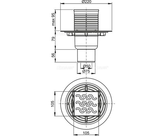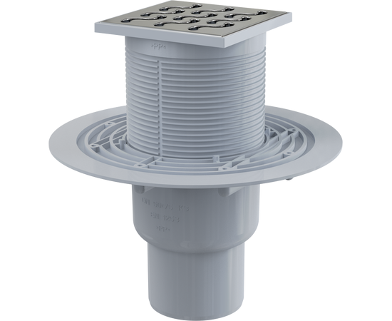 Сливной трап 105 × 105/50/75, подводка – прямая, решетка латунь-хром, гидрозатвор – мокрый, арт. APV202