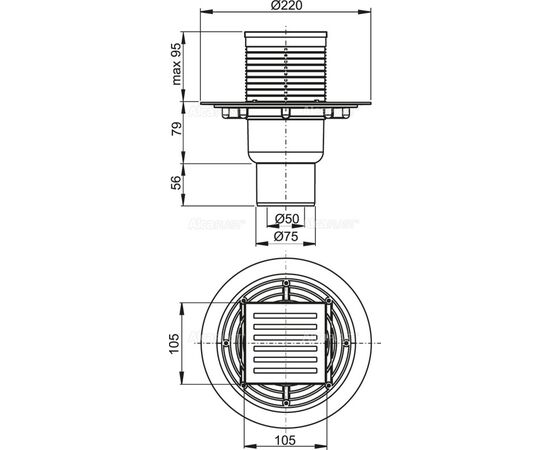 Сливной трап 105 × 105/50/75, подводка – прямая, решетка латунь-хром, гидрозатвор – мокрый, арт. APV203