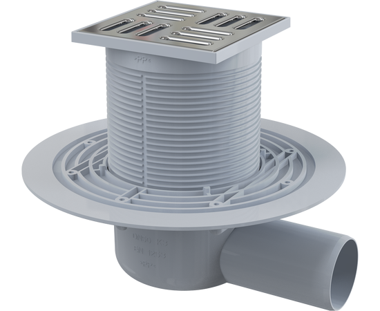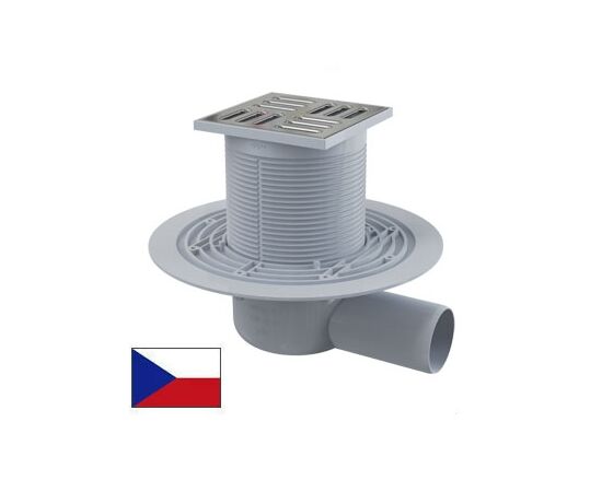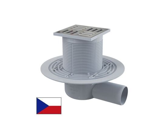 Сливной трап 105 × 105/50, подводка – боковая, решетка – нержавеющая сталь, гидрозатвор – мокрый, арт.APV1311