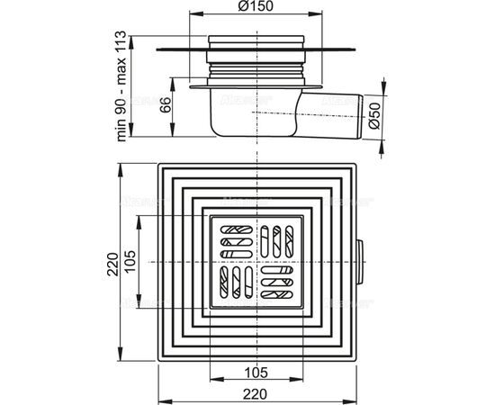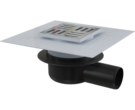 Сливной трап 105 × 105/50 подводка – боковая, решетка – нержавеющая сталь, воротник – 2-х уровневая изол, арт.APV26C