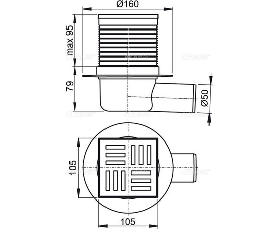 Сливной трап 105 × 105/50, подводка – боковая, решетка – серая, гидрозатвор – мокрый, арт. APV5111