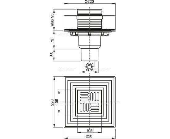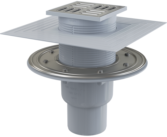 Сливной трап 105 × 105/50, подводка – прямая, решетка – нержавеющая сталь, фланец –нержавеющая сталь, арт.APV2324