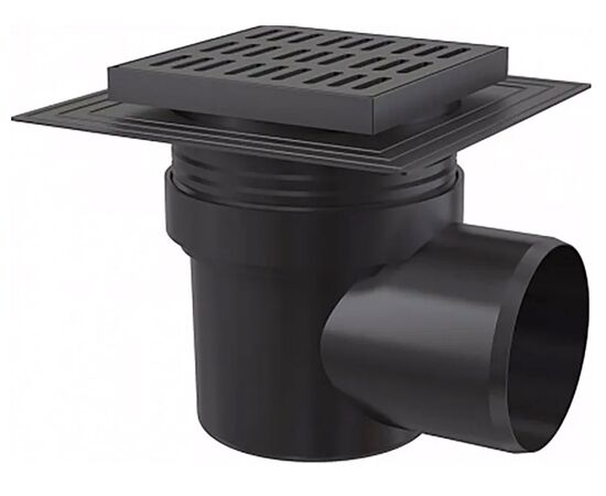 Сливной трап 150 × 150/110, подводка – боковая, решетка – черная, воротник – 2-х уровневая изоляция, арт.APV10C