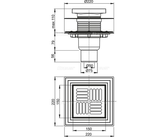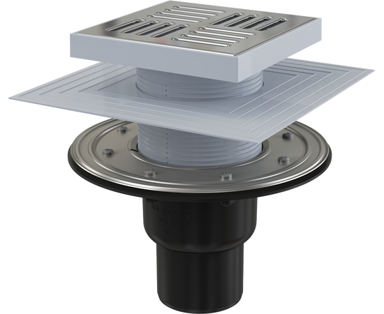 Сливной трап 150 × 150/50/75, подводка – прямая, решетка – нержавеющая сталь, фланец –нержавеющая ст, 2-х уров.изол,гидр-р сухой и мокрый, арт.APV4444
