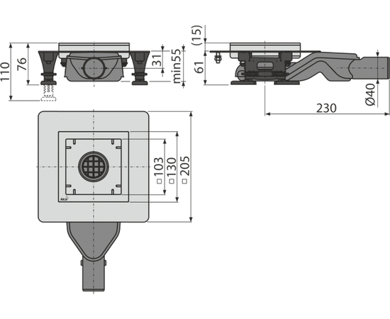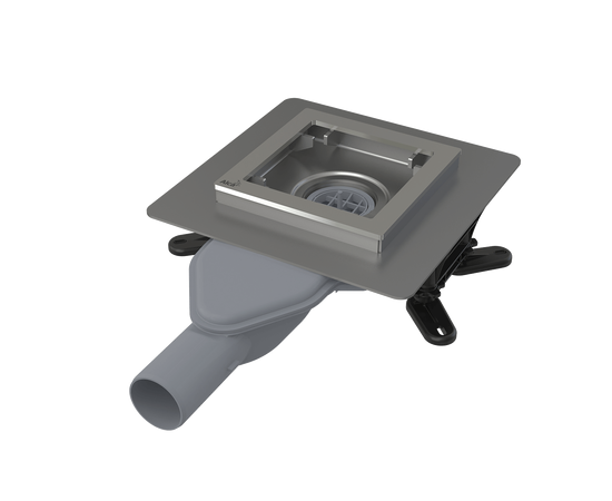 Сливной трап из нержавеющей стали зкстра низкий 130×130 мм боковой сток, без pешетки, гидрозатвор мокрый, арт.APV110