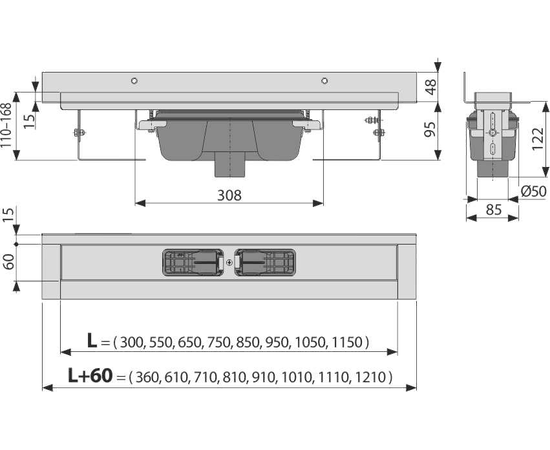 Водоотводящий желоб с порогами для цельной решетки с воротником к стене, арт.APZ1016-1150
