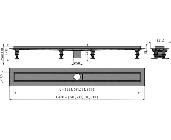Водоотводящий желоб с порогами для решетки или решетки под плитку, без гидроз., арт.APZ2012-550