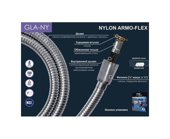 GLA-NY Шланг для душа металл/хром 150 см. двойной замок имп/кон, нейлоновая вставка в цветной коробке